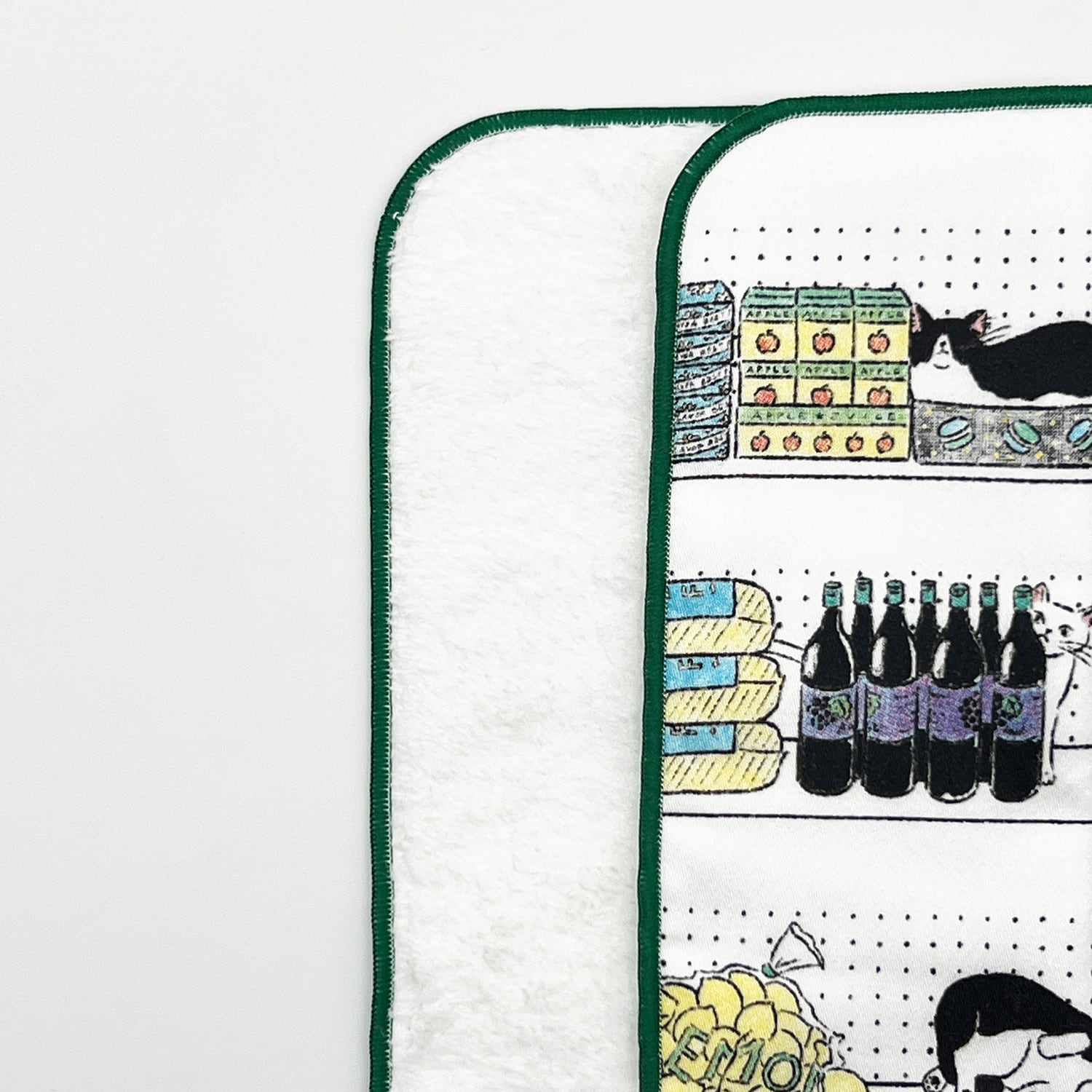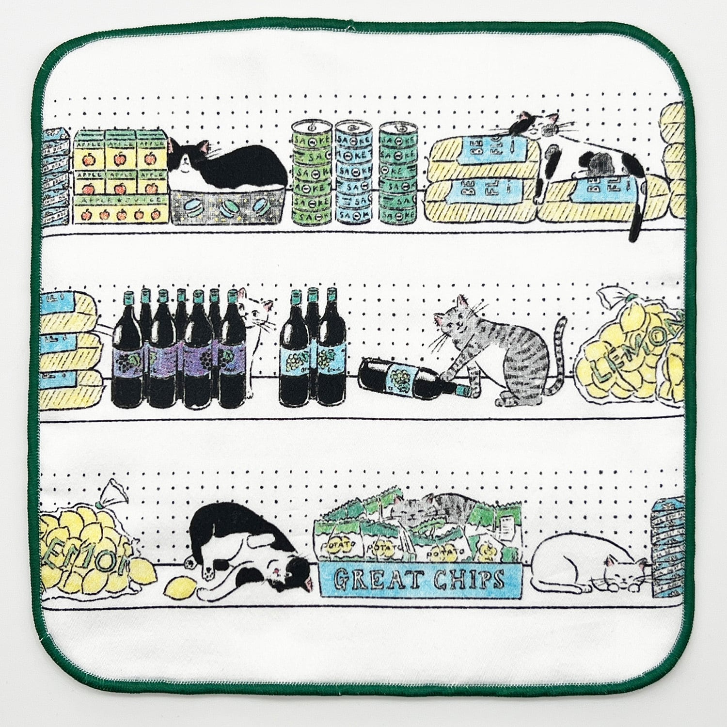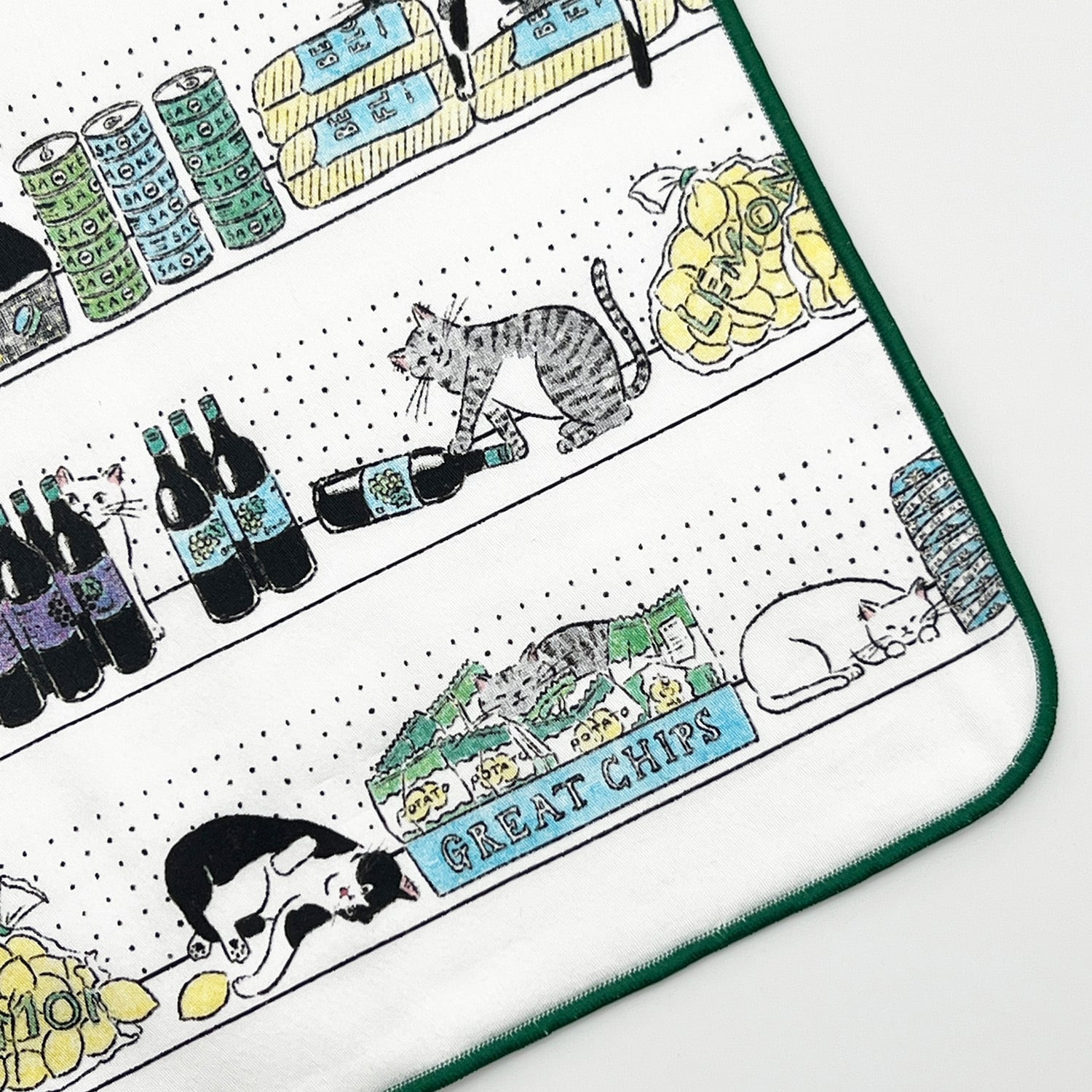 海外の食料品店の棚に居座るいたずら猫たちを描きました。箱に入って眠る猫や売り物で遊ぶ猫、お菓子に紛れる猫など自由に過ごしています。